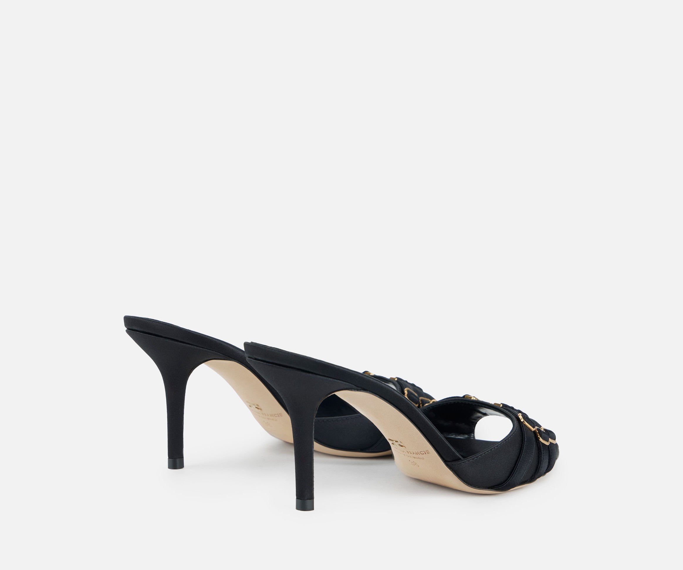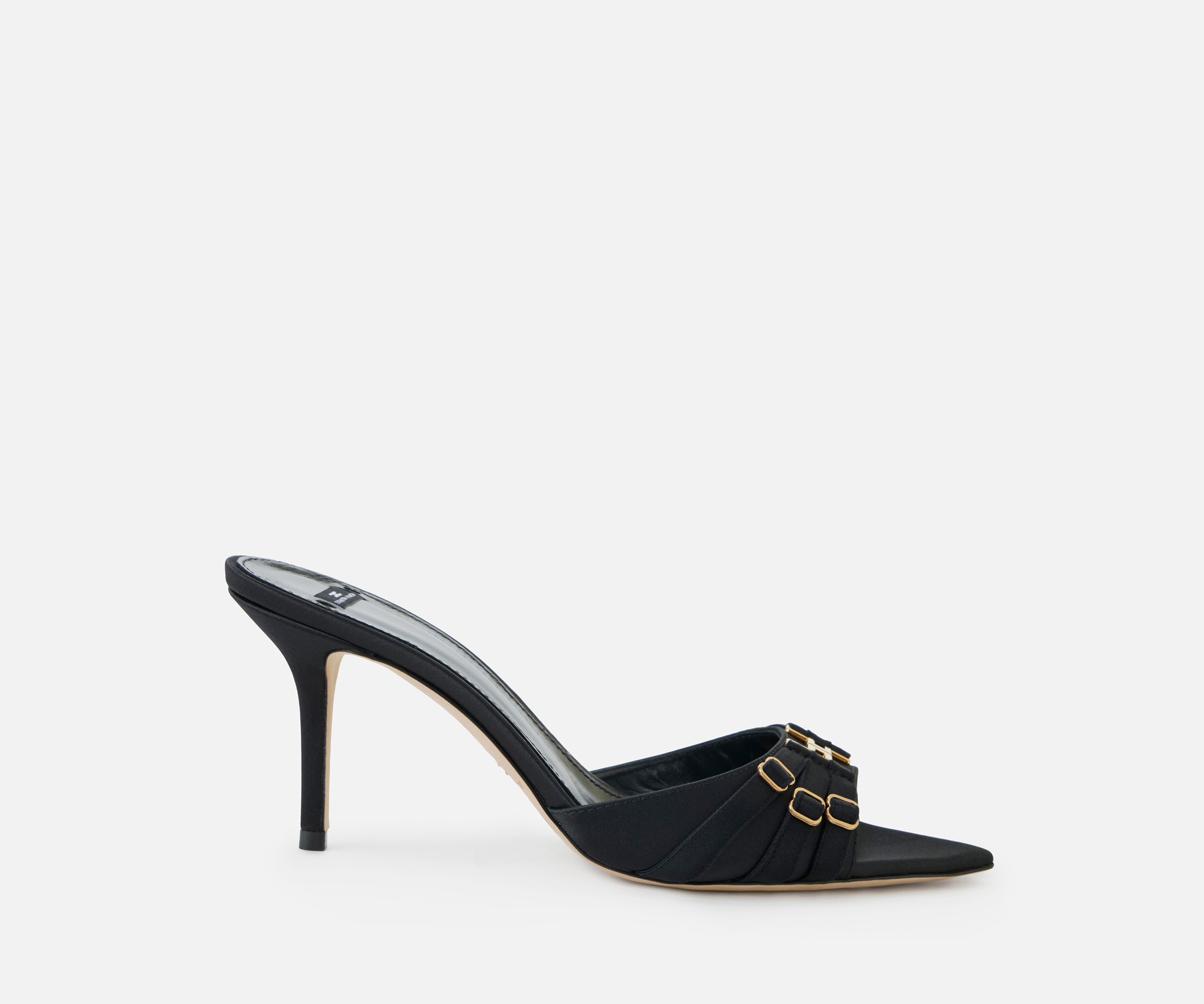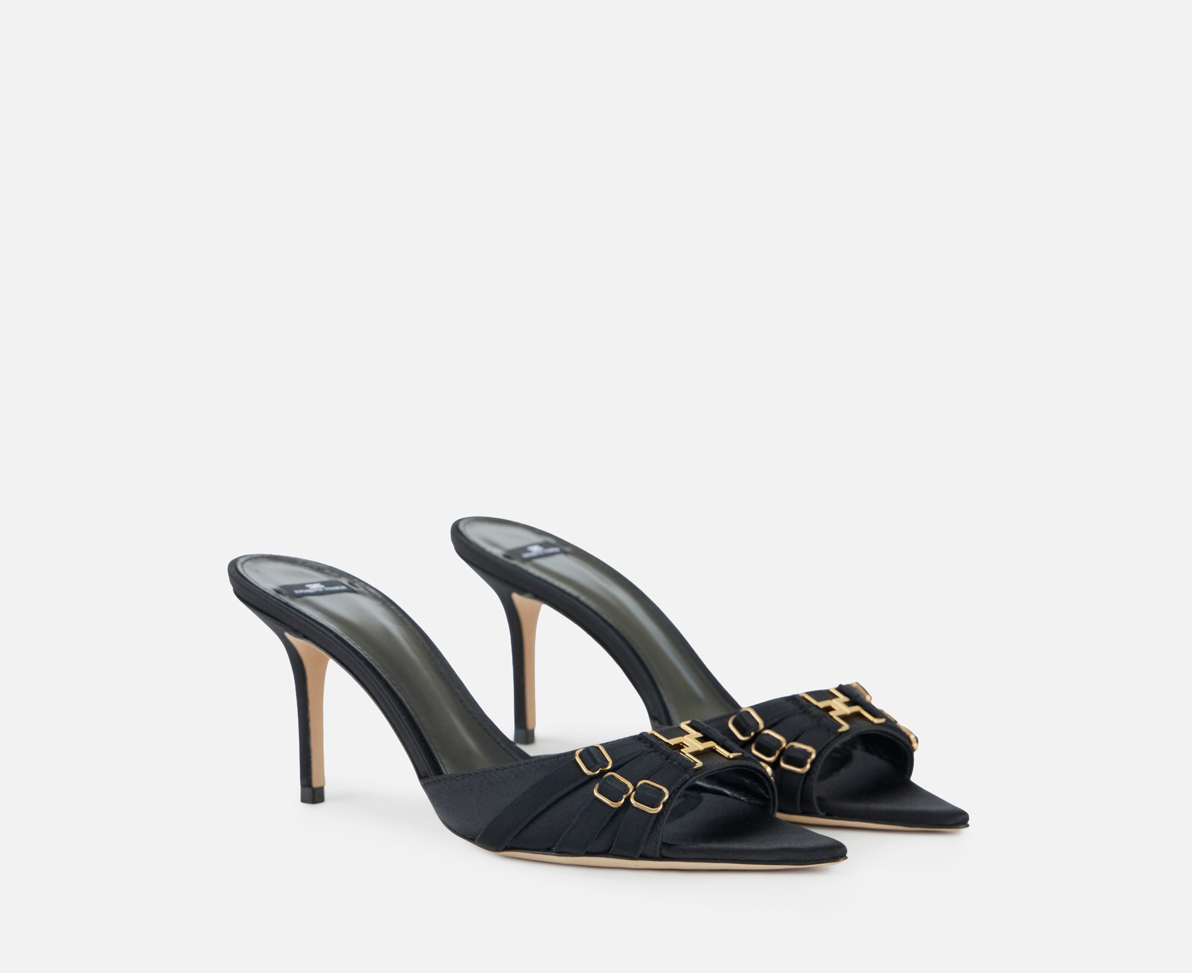 Klapki ELISABETTA FRANCHI w czarnym kolorze. Klapki wykonane ze skóry z cholewką pokrytą satyną. Wyróżniają się elastycznymi wstawkami inspirowanymi stylem gorsetowym oraz metalowym, złotym logo z przodu. Obcas 7.5cm