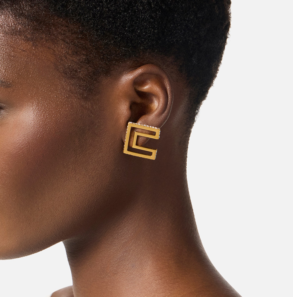 Kolczyki ELISABETTA FRANCHI wykonane z metalu ze złoconym wykończeniem. O minimalistycznym kształcie w formie logo, z bokami ozdobionymi błyszczącymi kryształkami.