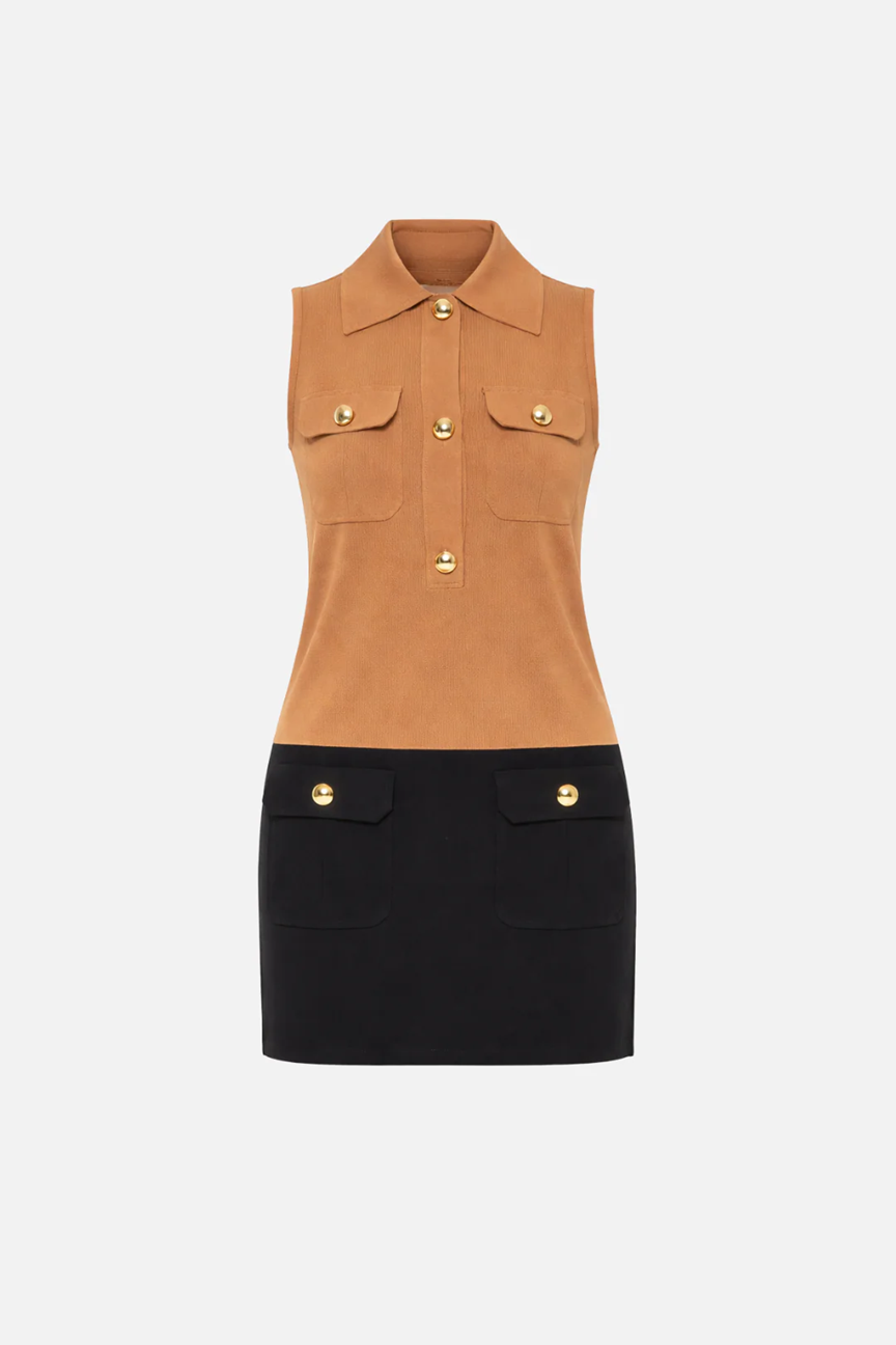 Sukienka ELISABETTA FRANCHI o estetycznym kroju, elegancko podkreśla figurę, czyniąc ją uniwersalnym i natychmiast rozpoznawalnym elementem garderoby. Góra inspirowana koszulą ze strukturalnym kołnierzykiem i zapięciem z przodu ozdobionym złotymi, metalowymi guzikami. Kontrast z dolną częścią nadaje sukience charakteru a kieszenie z klapkami dodają projektowi funkcjonalności.