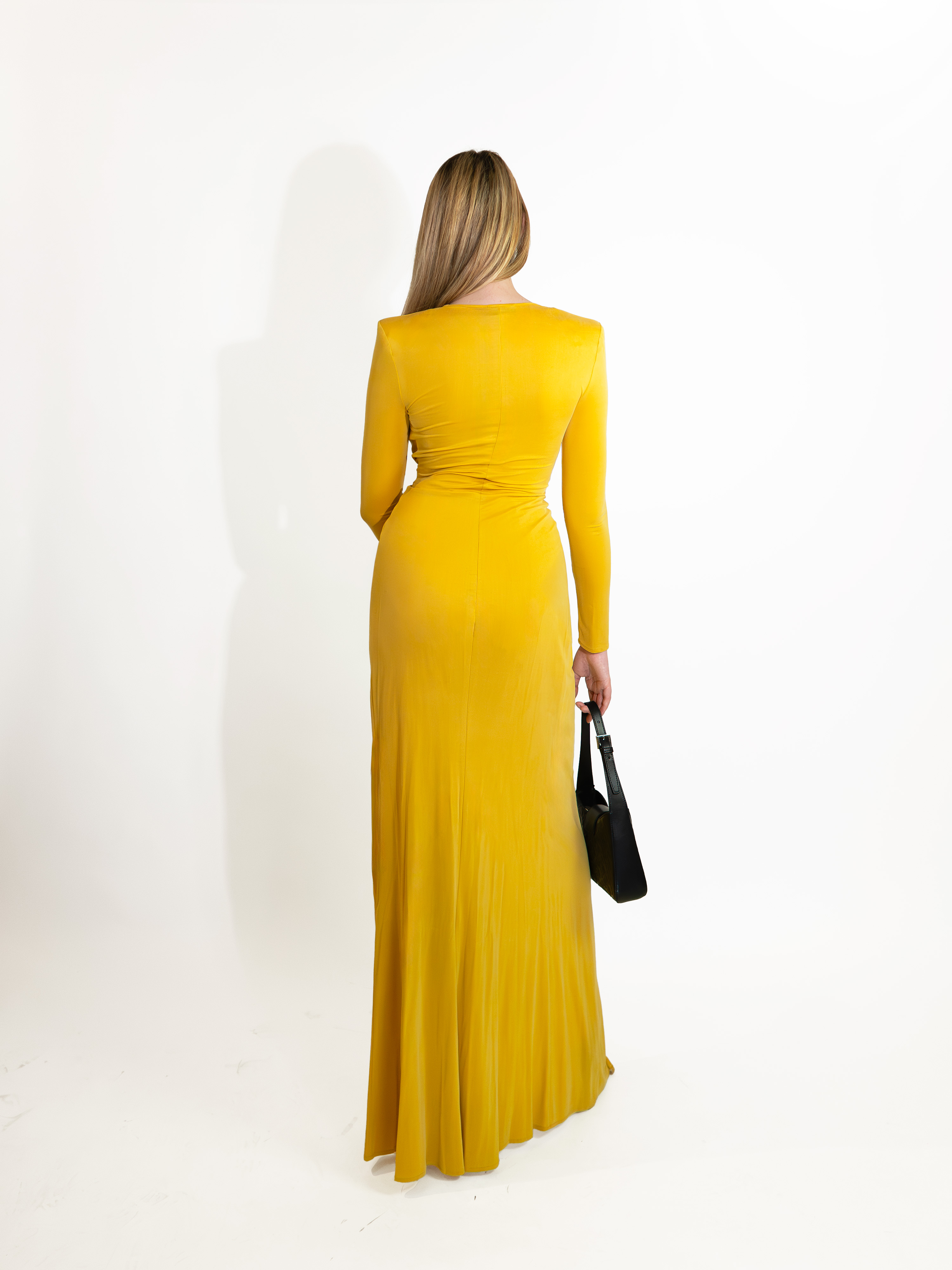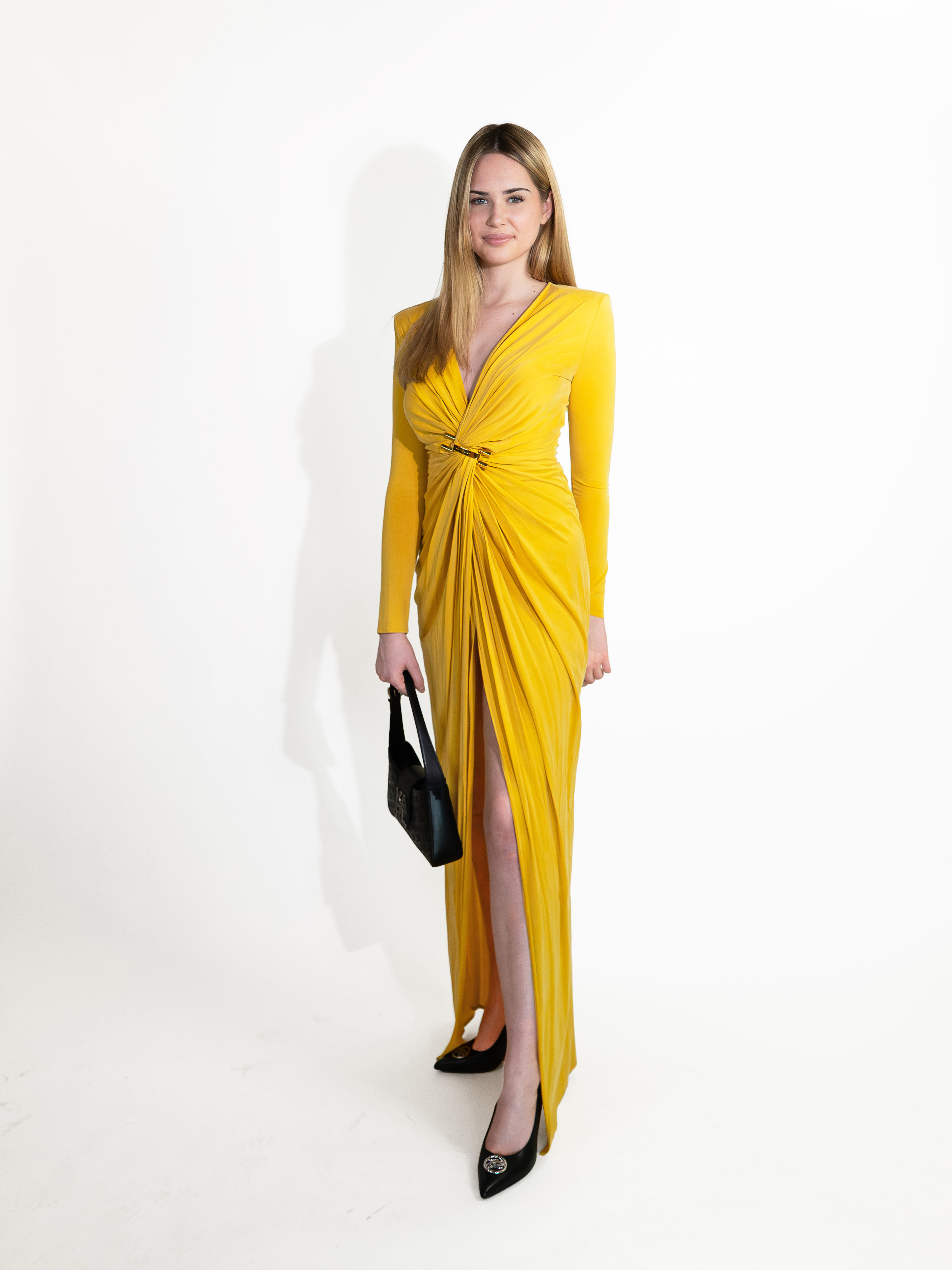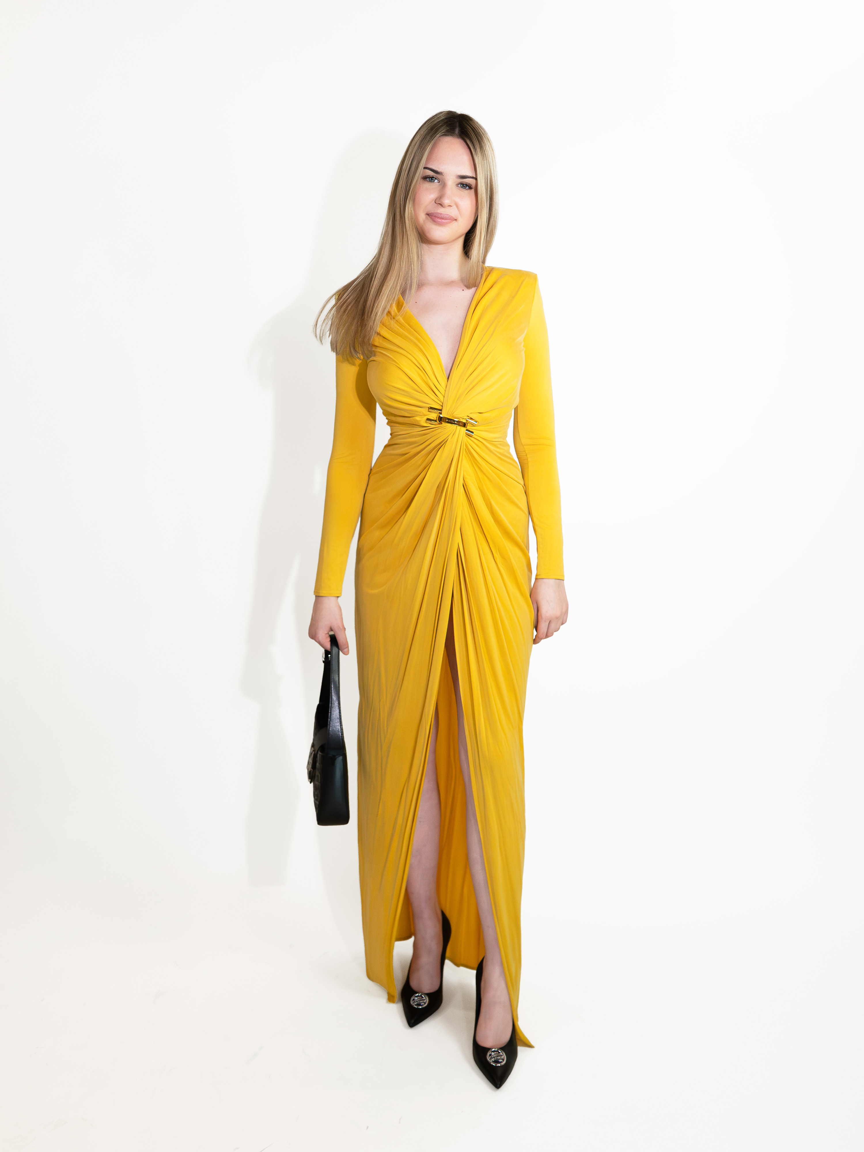 Sukienka red carpet ELISABETTA FRANCHI w słonecznym kolorze. Suknia wieczorowa z dżerseju cupro o dopasowanym kroju. Model posiada wyprofilowane ramiona i długie rękawy. Charakteryzuje się głębokim dekoltem w szpic, który podkreśla dół z rozcięciem pośrodku z przodu. Hipnotyczny motyw drapowania wzbogacony jest biżuteryjnym detalem z logo i kryształków.