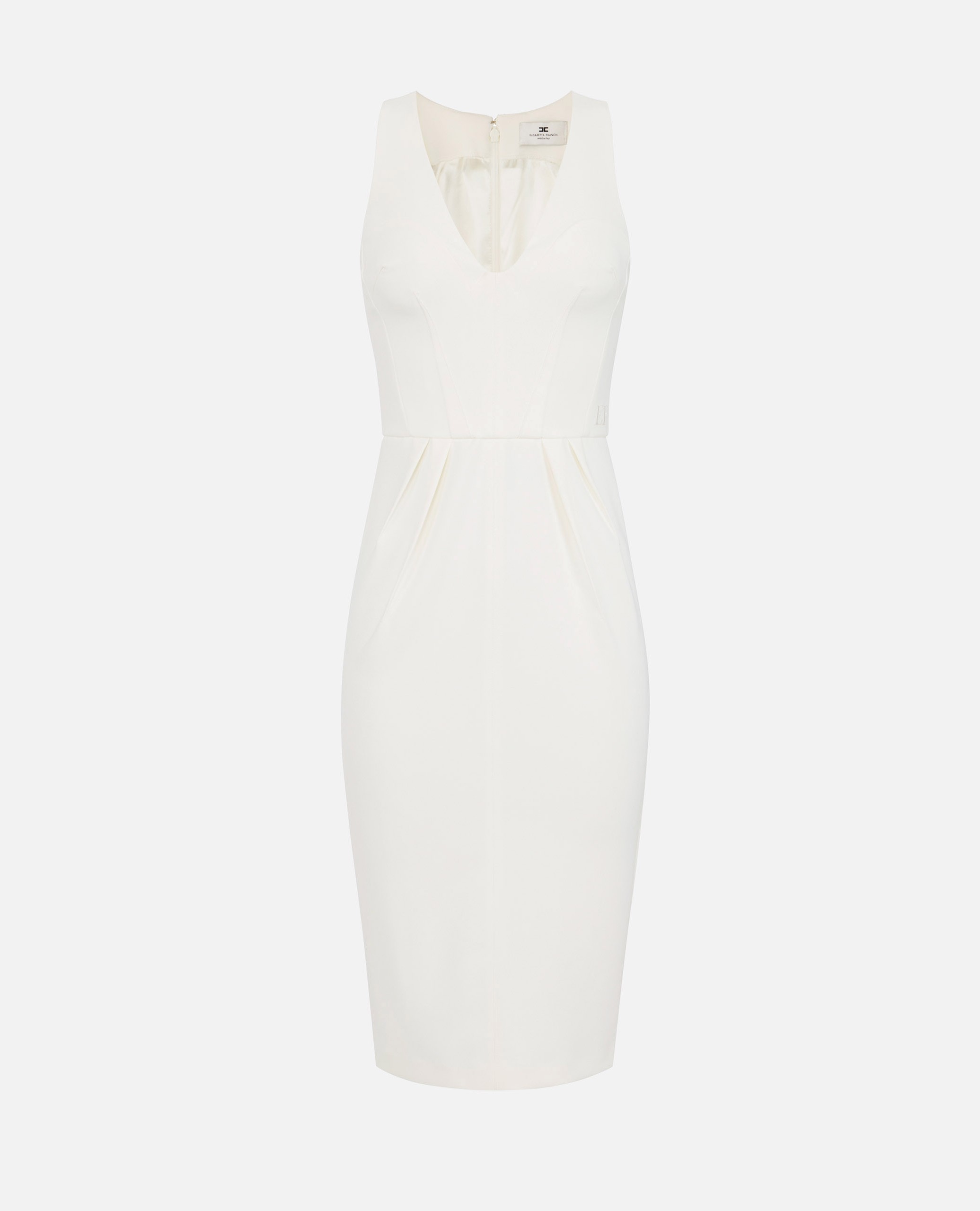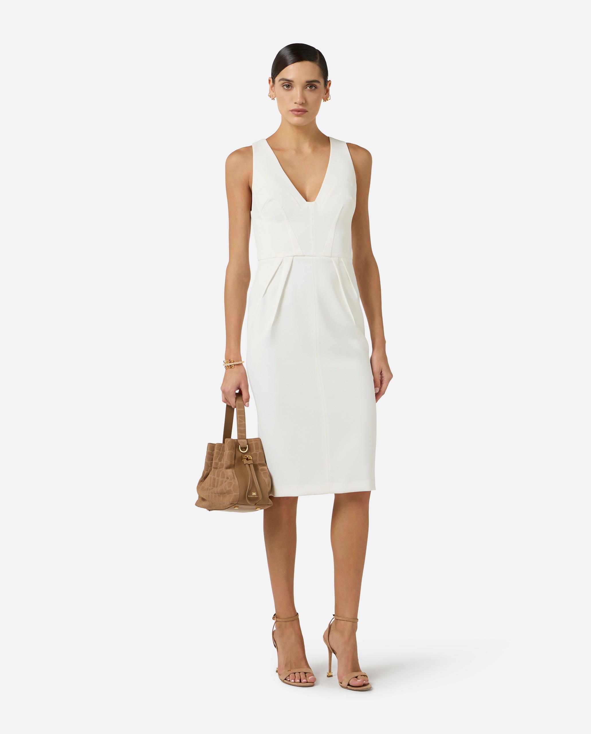 Sukienka ELISABETTA FRANCHI z lekkiej krepy. Sukienka bez rękawów, z dekoltem w kształcie litery V. Wyróżnia się zaszewkami wszytymi i wywiniętymi na zewnątrz, które tworzą plisy inspirowane origami. Całość dopełnia logo haftowane na pasie. Krój dopasowany.