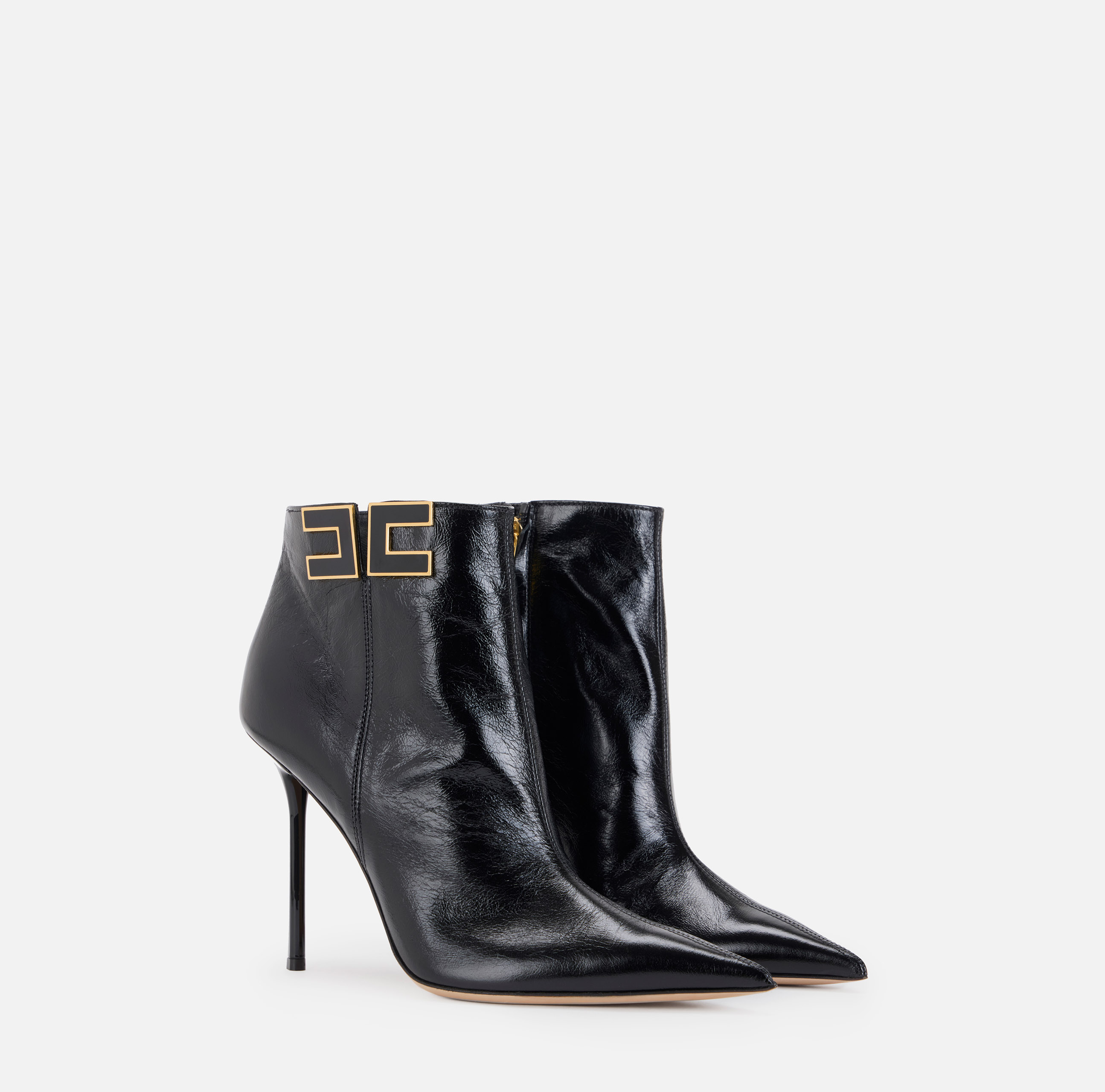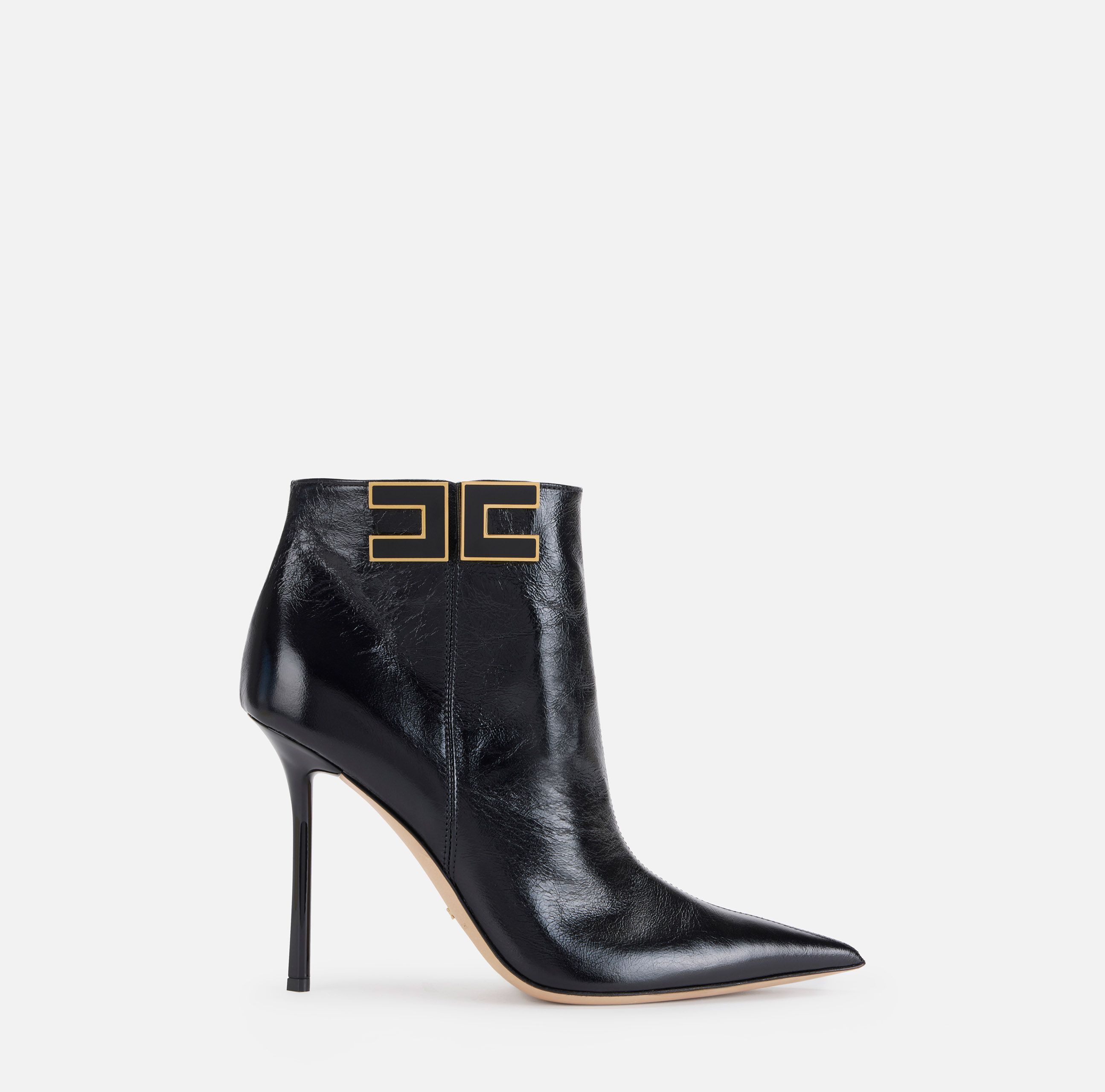 Botki ELISABETTA FRANCHI na szpilce ze zwężanym noskiem. Charakteryzują się bocznym logo z brzegami ze złoconym wykończeniem, wnoszącymi świetlisty kontrast. Wysokość szpilki: 10 cm.