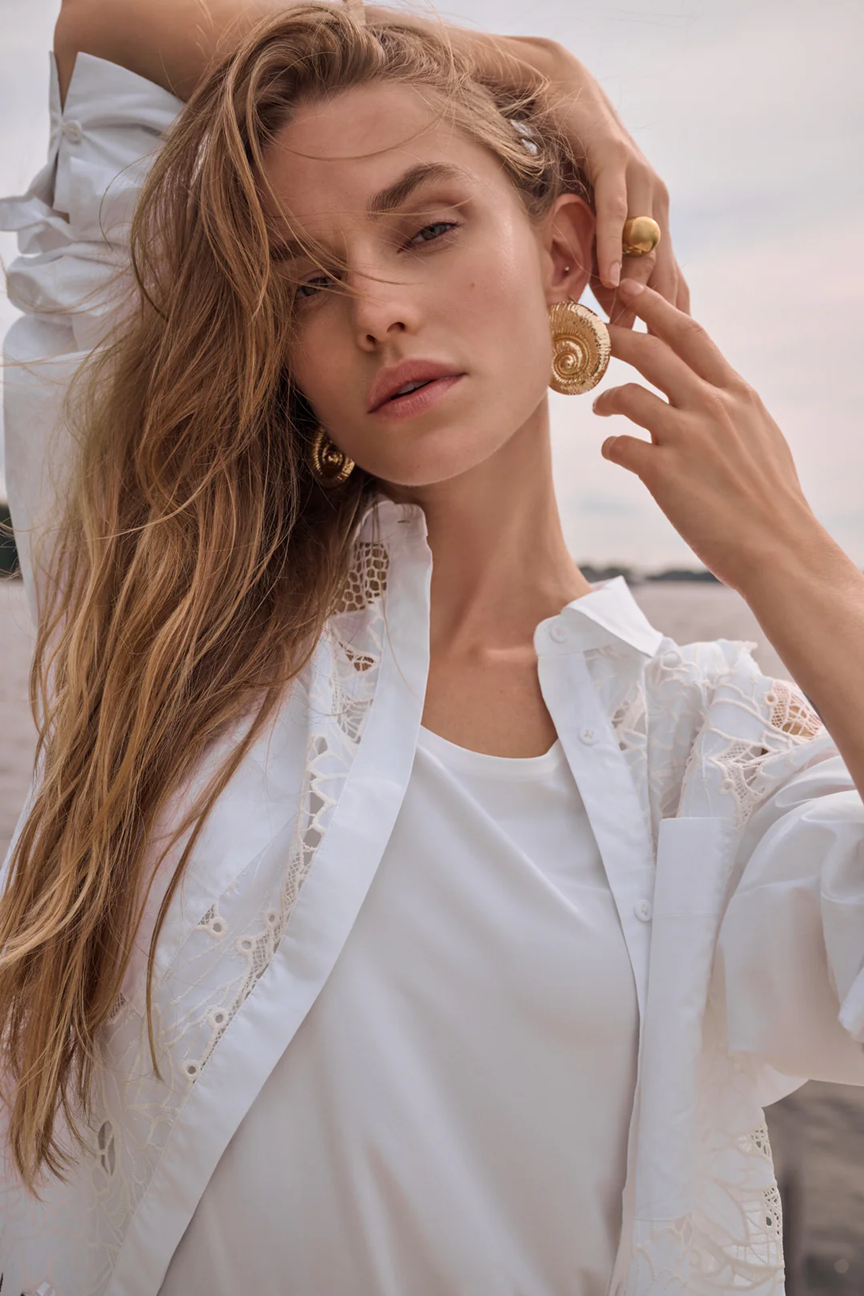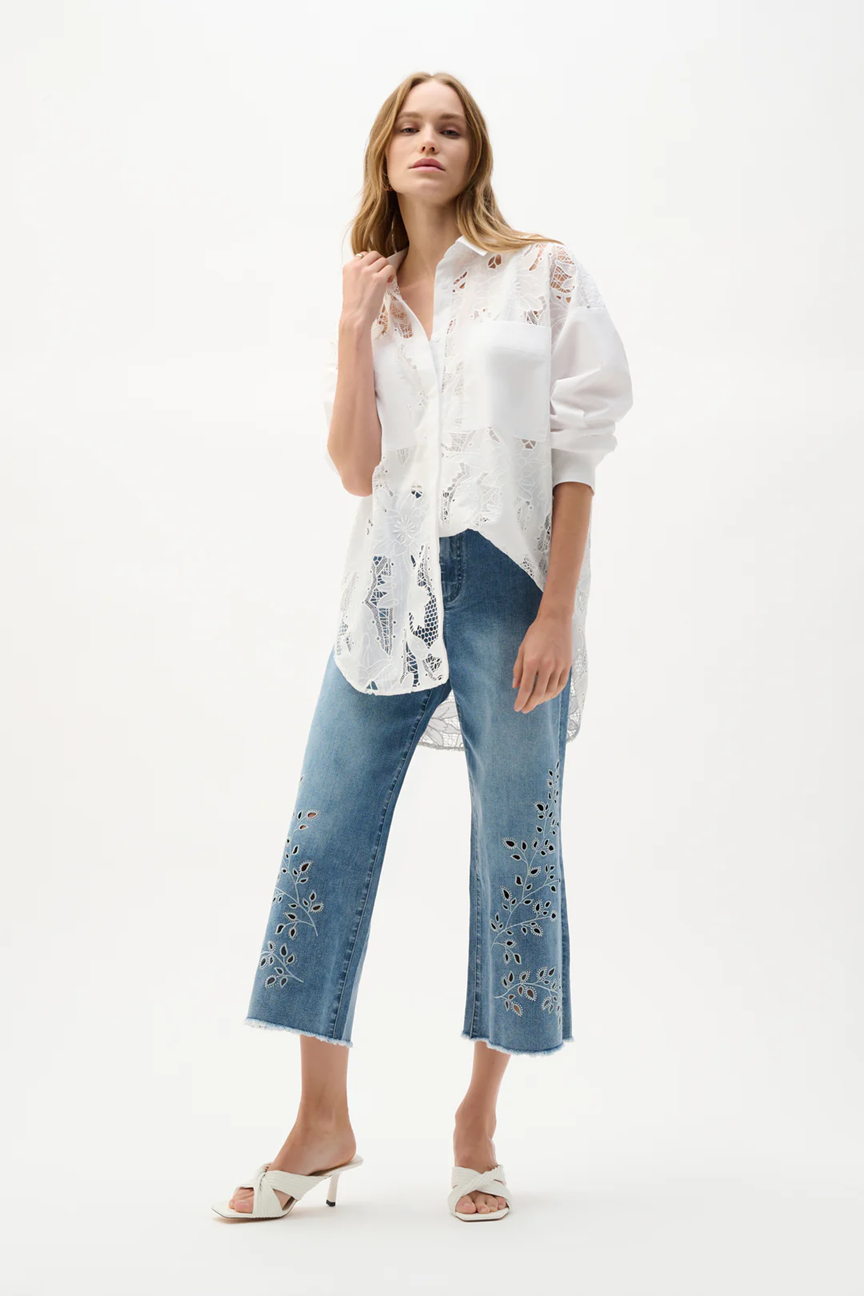 Bluzka JOSEPH RIBKOFF wykonana z najwyższej jakości bawełny. Łączy delikatną haftowaną koronkę z wyrafinowanymi detalami strukturalnymi. Pudełkowy krój i obniżone ramiona tworzą dyskretną elegancję, a mankiety rękawów i wysoki, niski dół koszuli nadają jej nowoczesny charakter. Koronkowe akcenty zdobią kołnierzyk, plisę, rękawy i kieszenie, zapewniając wyrafinowaną wszechstronność i możliwość noszenia zarówno warstwowo, jak i samodzielnie.