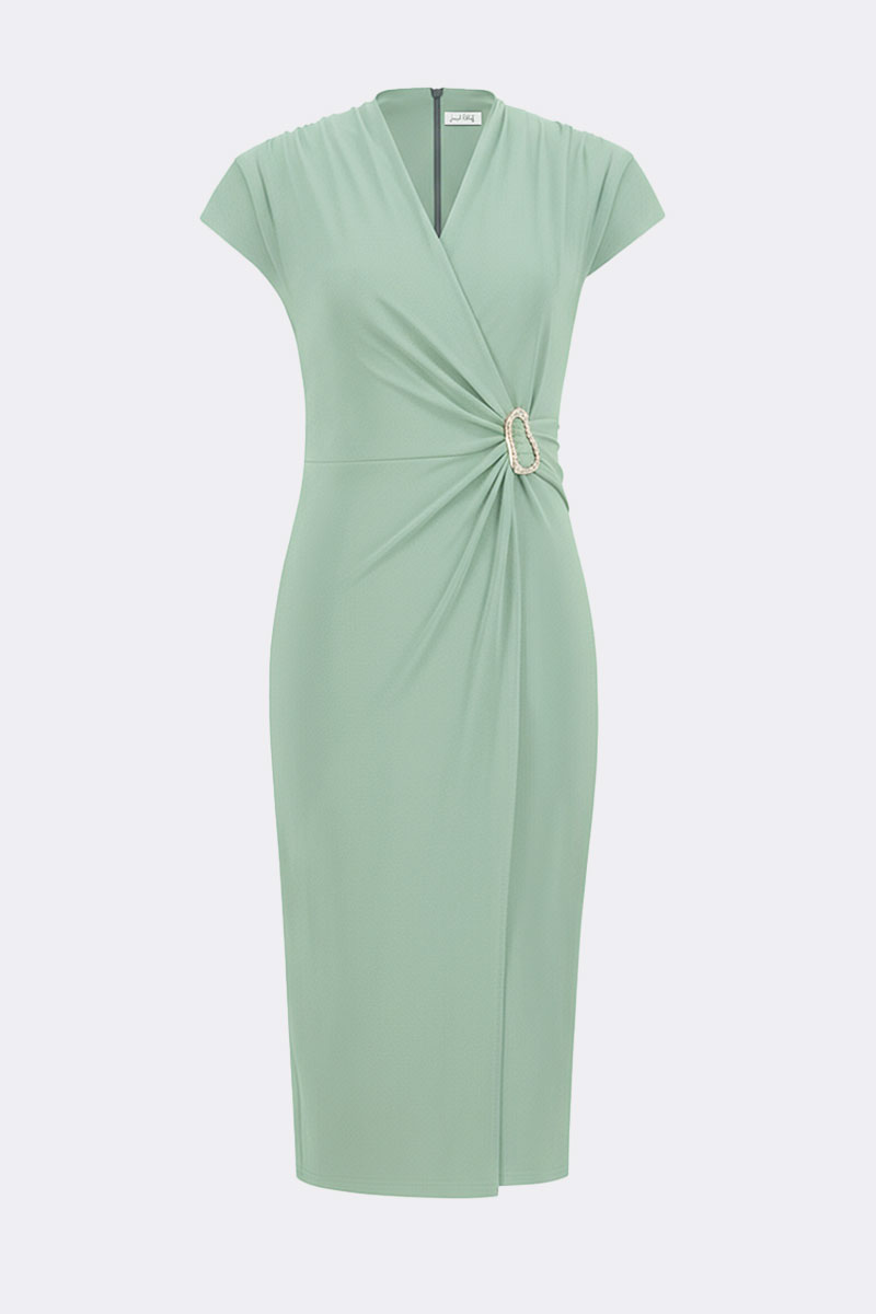 Elegancka sukienka JOSEPH RIBKOFF o kopertowym kroju. Ponadczasowy krój podkreślający sylwetkę. Z zabudowanym dekoltem i delikatnymi marszczeniami na ramionach. Ozdoba z kryształków podkreśla talię, a rękawy typu cap i długość za kolano dopełniają stylizację ponadczasową elegancją.