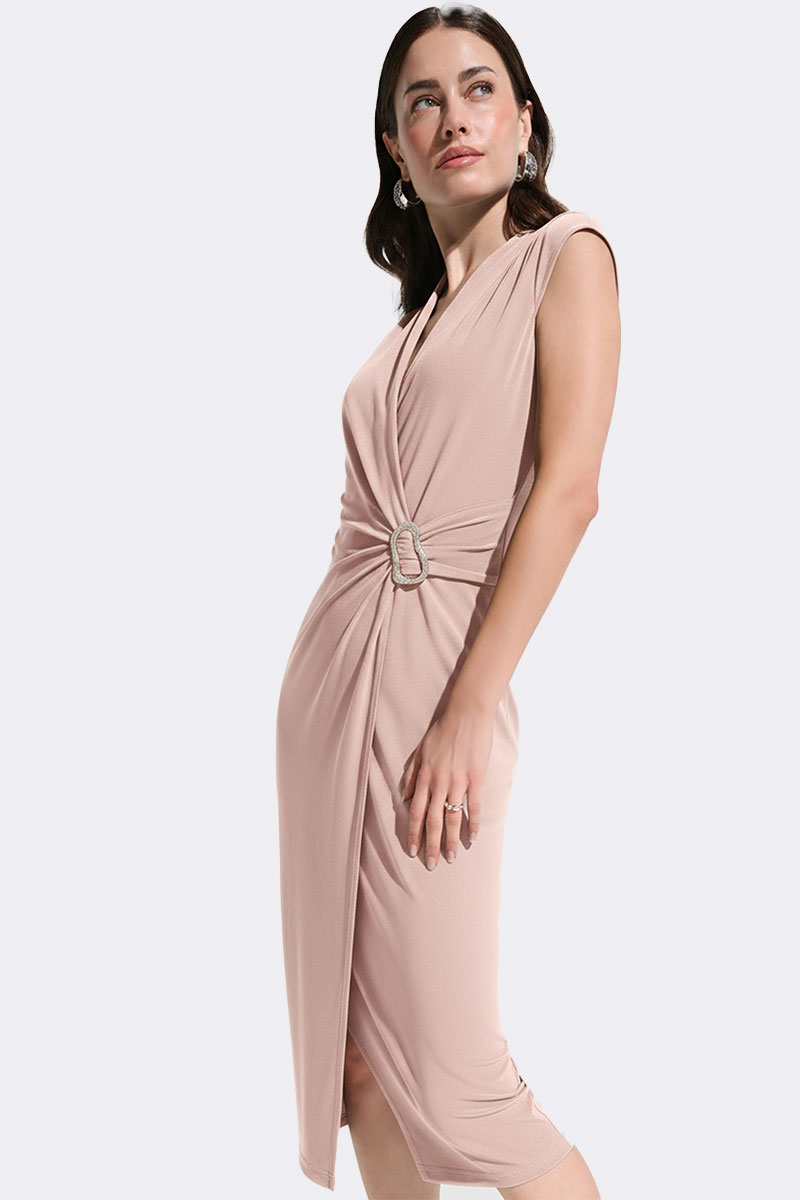 Elegancka sukienka JOSEPH RIBKOFF o kopertowym kroju. Ponadczasowy krój podkreślający sylwetkę. Z zabudowanym dekoltem i delikatnymi marszczeniami na ramionach. Ozdoba z kryształków podkreśla talię, a rękawy typu cap i długość za kolano dopełniają stylizację ponadczasową elegancją.