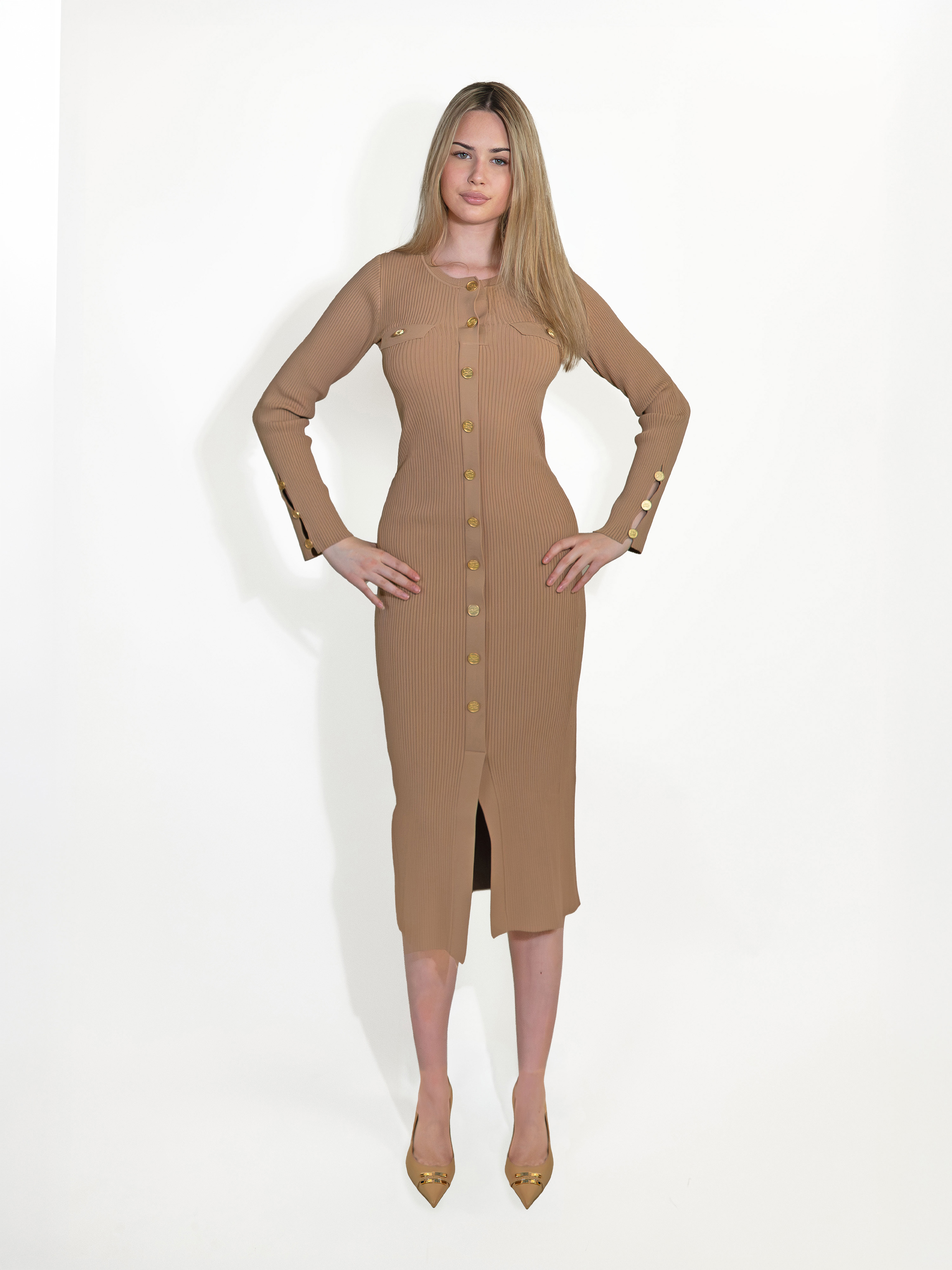 Dzianinowa sukienka KARL LAGERFELD wykonana z cienkiej, elastycznej dzianiny. Model z wyjątkowo komfortowego materiału z wysoką zawartością wiskozy. Dopasowany, podkreślający sylwetkę fason. Imitacja kieszeni na piersi. Model wykonany z dzianiny prążkowanej. Posiada rozcięcie.
