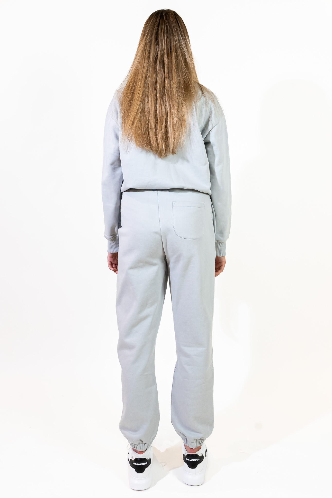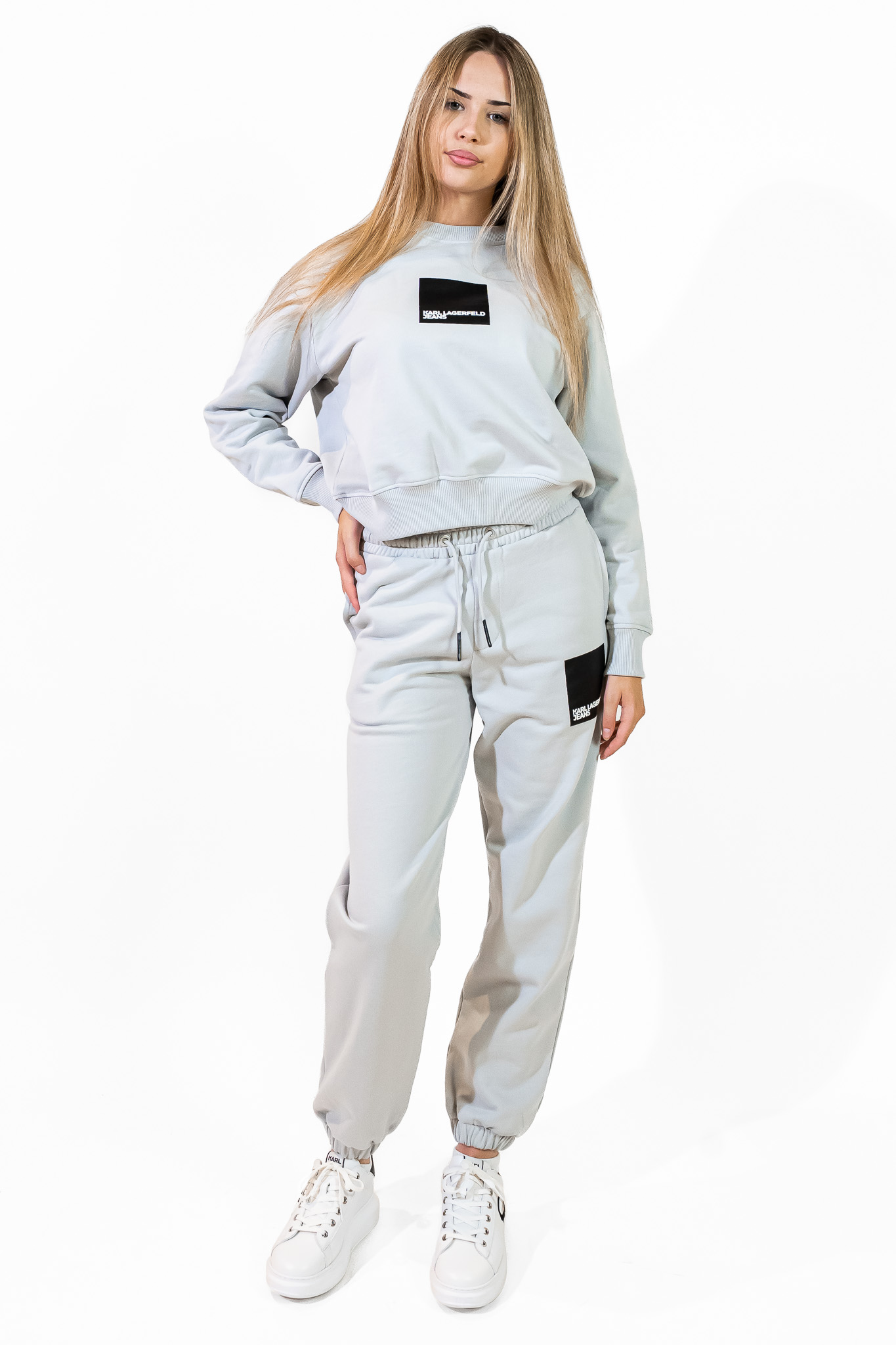 Komplet z bluzą i joggerami z logo. Bluza bez kaptura KARL LAGERFELD JEANS o klasycznym kroju z zapewniającym najwyższy komfort okrągłym dekoltem i długimi rękawami. Wygodne, dresowe spodnie z regulacją w pasie. Komplet składa się ze spodni w rozmiarze XS oraz bluzy w rozmiarze S ze względu na oversizowy krój spodni.