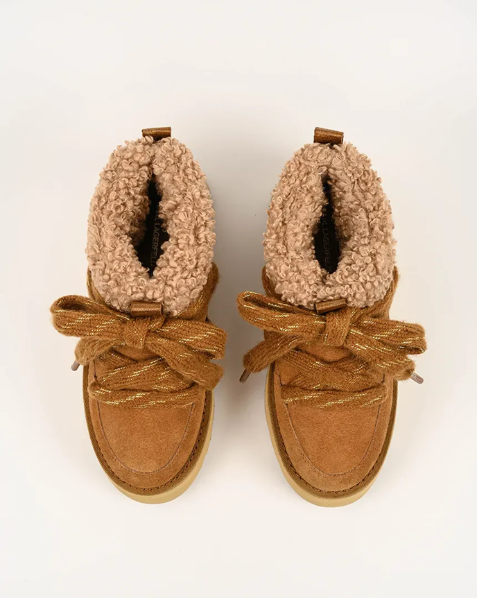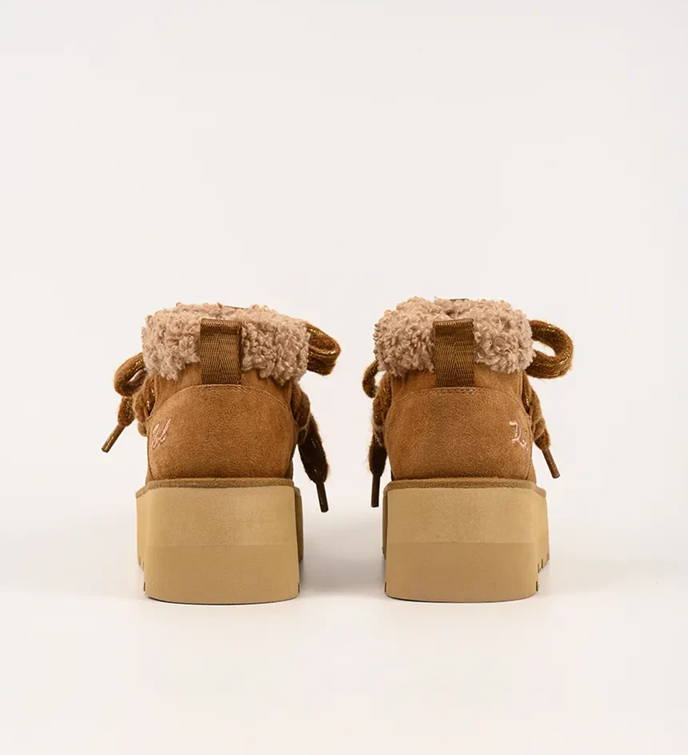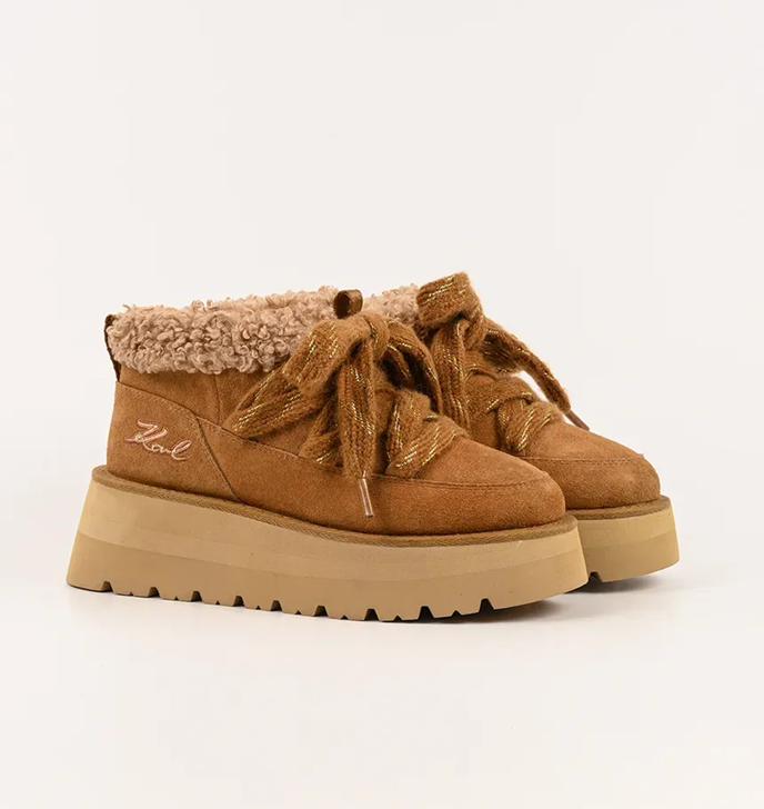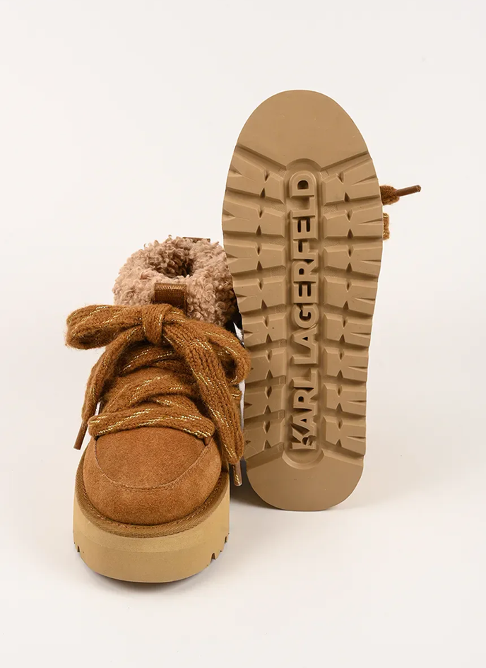 Śniegowce KARL LAGERFELD w kolorze toffee z okrągłym noskiem. Wykonane ze skóry zamszowej. Podwyższona cholewka, sznurowane, miękko wyściełany środek. Logowane na boku, bardzo ciepłe.