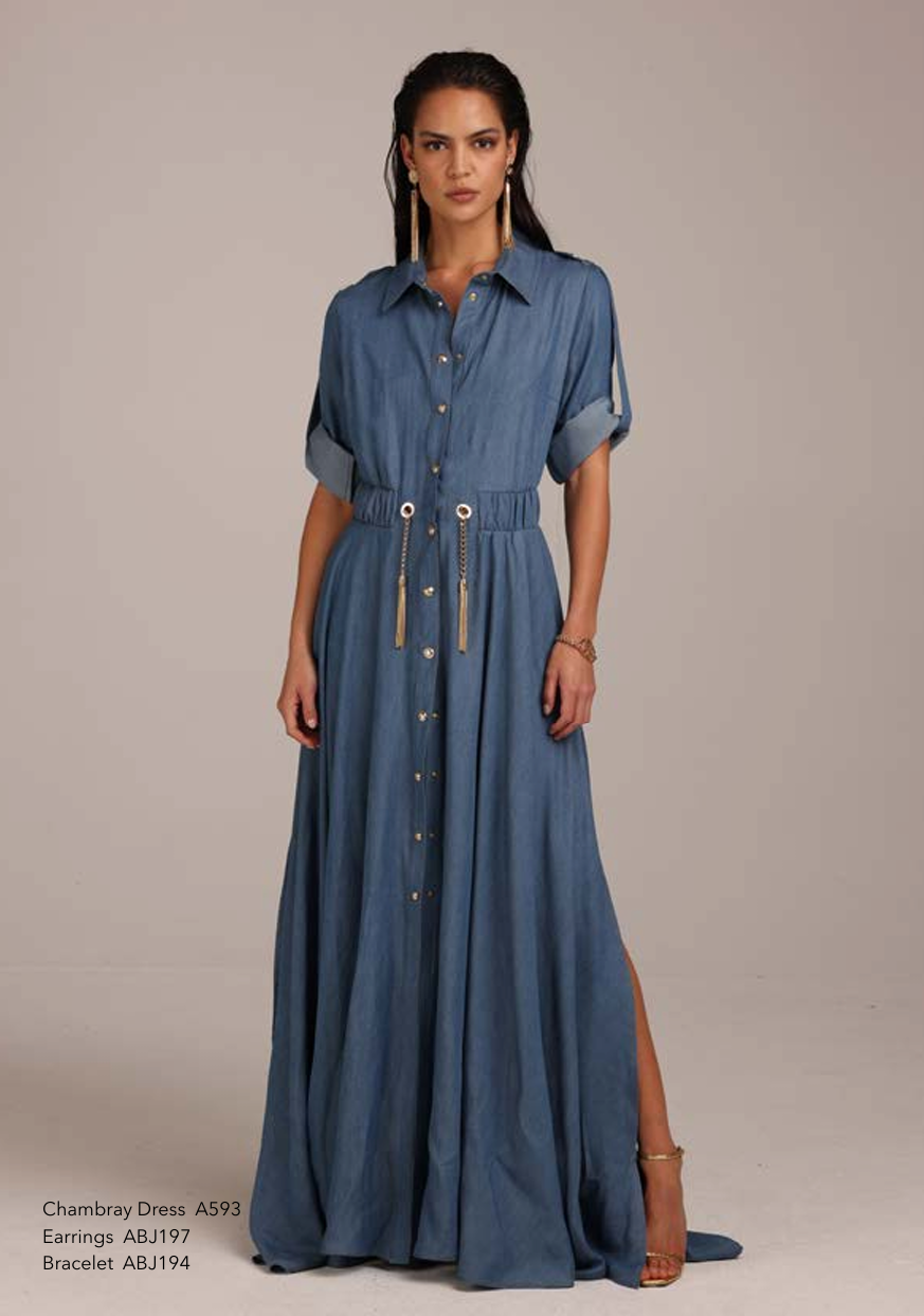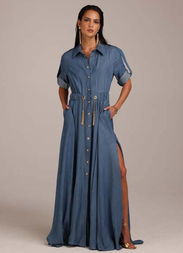 Jeansowa sukienka MONIQUE GARCONNE w niebieskim kolorze. Sukienka z kołnierzykiem, zapinana na zatrzaski. Długa rozkloszowana do dołu. Z rękawami o długości 3/4. W pasie ściągacz oraz ozdobne złote wykończenia. Bardzo efektowna.